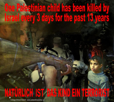 One Palestinian child has been killed by Israel every 3 days for the past 13 years - Official statistics from the Ministry of Information in Ramallah have revealed that 1,518 Palestinian children were killed by Israel’s occupation forces from the outbreak of the second Intifada in September 2000 up to April 2013. That’s the equivalent of one Palestinian child killed by Israel every 3 days for almost 13 years. The ministry added that the number of children injured by the Israelis since the start of the Second Intifada against Israel’s occupation has now reached 6,000. “The International Day for the Protection of Children is on June 1,” said a spokesman, “but Palestinian children are still subject to attacks by the Israelis and Jewish settlers on an almost daily basis.” Noting that 2012 saw an unprecedented rise in the number of children arrested by Israeli forces, the report pointed out that 9,000 Palestinians under 18 years old have been arrested since the end of September 2000. Almost half of the Palestinian population is under 18. Almost two hundred and fifty Palestinian minors are being held in prison by Israel; 47 of them are children under 16 years of age. >>>