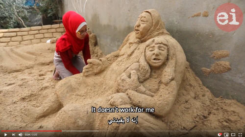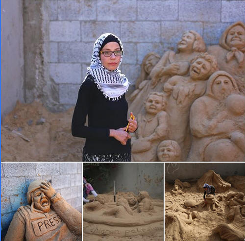 Pal Stimme Ilmenau - PSI - 17. 2. 2020 - Rana Ramlawi ist eine Sandbildnerin aus Gaza Stadt. Zuerst malte sie in den Sand, später begann sie ihn zu plastischen Figuren zu formen. Mit der Unterstützung ihrer Familie entwickelte sie ihr Talent weiter, und formt heute große Skulpturen, deren Erschaffung oft mehrere Tage dauern.