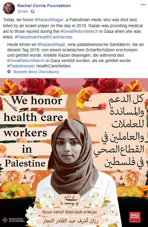 Dokumentation - Am 1. 6. 2018 wurde Razan Al-Najjar ermordet. >>> |