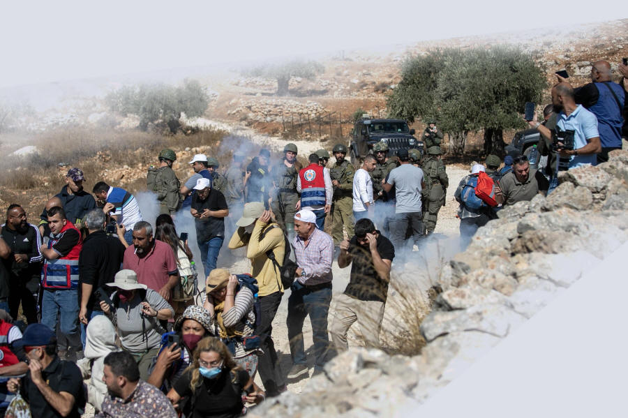 Israelische Siedler greifen palästinensische Bauern während der Olivenernte im Dorf Kufr Qlil südlich von Nablus an und stehlen die Oliven der Palästinenser.