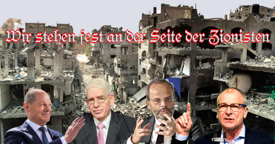 Allen voran die Bundesregierung, deren vorbehaltlose Unterstützung Israels eine Bundeskanzlerin, einen Außenminister und einen Botschafter in Israel einschließt, die alle nach wie vor die Verbrechen Israels angesichts des Völkermords leugnen.