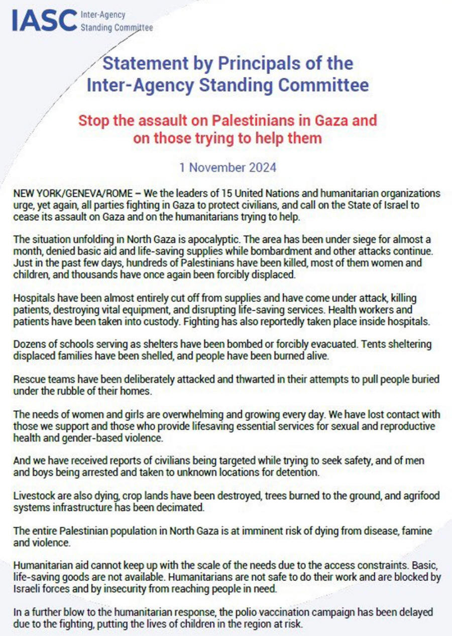 Statt den in dem Brief von Mitte Oktober geforderten 350 Lastwagen pro Tag, humanitären Pausen und einem Ende der Abriegelung von Nordgaza ist das Gegenteil der Fall: Das UN-Nothilfebüro Ocha meldet seit dem 6. Oktober eine verschärfte Blockade in Nordgaza, besonders um das Flüchtlingslager Dschabalia. Alleine in der vergangenen Woche habe es sieben „mass casualty events“ gegeben.