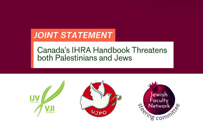 Die Vorstände von Independent Jewish Voices (IJV), United Jewish People's Order (UJPO) und Jewish Faculty Network (JFN) lehnen die heutige Veröffentlichung eines Handbuchs ab, das Richtlinien für die Anwendung der weithin diskreditierten neuen Definition von Antisemitismus der International Holocaust Remembrance Alliance (IHRA) bietet. Das Handbuch wurde 2021 von Premierminister Justin Trudeau in Auftrag gegeben und heute von Deborah Lyons, der kanadischen Sonderbeauftragten für die Bewahrung der Erinnerung an den Holocaust und die Bekämpfung des Antisemitismus, veröffentlicht.