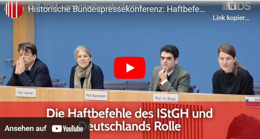 Eingeleitet wurde die Pressekonferenz durch eine Stellungnahme von Christine Binzel, Professorin für Wirtschaft und Gesellschaft des Nahen Ostens an der Friedrich-Alexander-Universität Erlangen-Nürnberg. Sie betonte, die Verbrechen durch die israelische Regierung und ihre Streitkräfte seien mittlerweile klar belegt. Berlin unterstütze Israel dabei „militärisch, politisch, finanziell und rechtlich“. Damit nicht genug, die Bundesregierung spreche bis heute – entgegen zahlreichen Berichten der Vereinten Nationen sowie internationaler Menschenrechtsorganisationen – dem Vorwurf, Israel begehe oder beabsichtige in Gaza einen Völkermord, jede Grundlage ab. Die vom Internationalen Strafgerichtshof ausgestellten Haftbefehle gegen Netanjahu und seinen ehemaligen Verteidigungsminister Joaw Galant bezeichnete Binzel in diesem Zusammenhang als „jüngsten Weckruf“ für Berlin, sich der Wirklichkeit zu stellen. Ebenso verwies sie auf den belegten Einsatz deutscher Waffen in Gaza und forderte vor diesem Hintergrund ein „vollständiges Waffenembargo“.