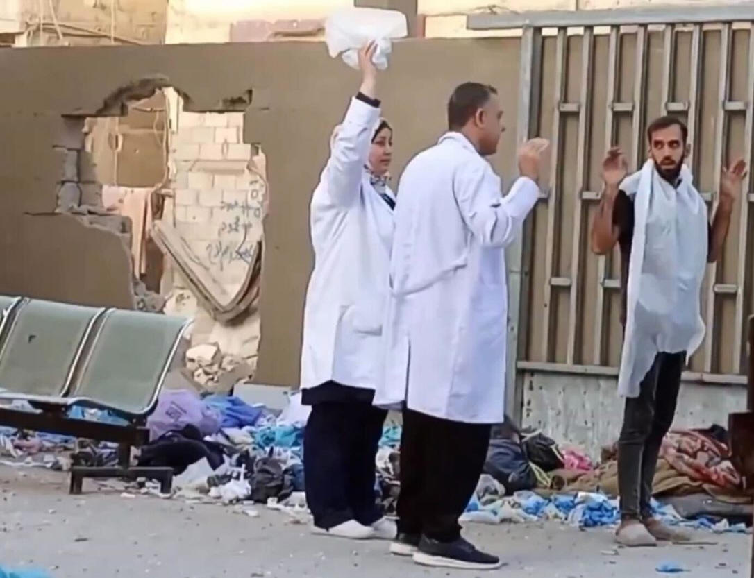 Der Direktor des Kamal Adwan Krankenhauses, Hussam Abu Safiyeh (Mitte), hält seine Hände während des israelischen Einmarsches in das Krankenhaus hoch, 26. Oktober 2024. (Foto: Screenshot/Social Media)