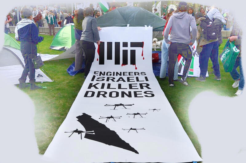 Auf einem Transparent auf dem Boden eines Studentencamps steht: „MIT-Ingenieure bauen israelische Killerdrohnen“.