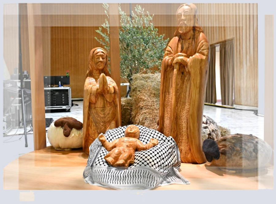 Die Krippe wurde von den Bethlehemer Künstlern Johny Andonia und Faten Nastas Mitwasi gestaltet und besteht hauptsächlich aus palästinensischen Materialien, darunter Olivenholz, ein Symbol für den Widerstand der Palästinenser.