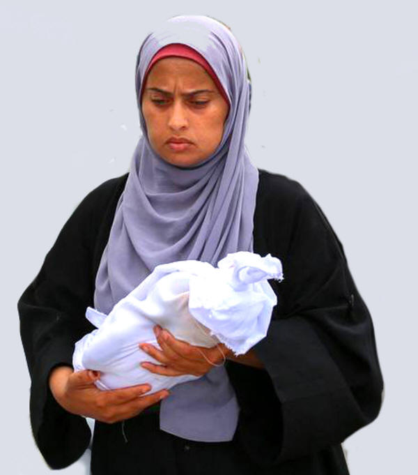 Eine Frau trägt die Leiche eines Neugeborenen, das bei einem Angriff auf das Nasser-Krankenhaus in Khan Younis, Gaza, getötet wurde.