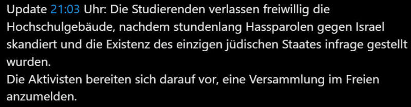 In einer Mitteilung fordern sie einen »Boykott israelischer Einrichtungen, welche den israelischen Apartheidstaat stützen«. Auch mit anderen Studentenprotesten weltweit solidarisieren sie sich. An der Freien Universität sowie der Humboldt-Universität in Berlin hatten die Universitätsleitungen Strafanzeige gestellt und die Studierenden räumen lassen. Das löste Kritik in Hochschulkreisen aus.