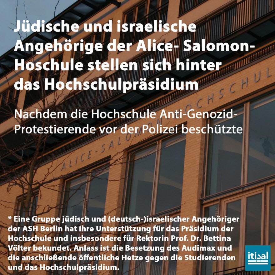 Wir, jüdisch-(deutsch-)israelische Angehörige und ehemalige Angehörige der ASH Berlin, möchten unsere Solidarität mit Prof. Dr. Bettina Völter sowie dem gesamten Präsidium der ASH Berlin im Zusammenhang mit der Besetzung des Audimax der Hochschule am 6. Januar 2025 zum Ausdruck bringen. Schon unmittelbar nach dem terroristischen Angriff der Hamas auf Israel am 7. Oktober 2023 hat sich Bettina Völter persönlich bei uns gemeldet – nicht nur, um zu fragen, wie es uns geht und was wir in dieser Situation an Support brauchen – sondern auch, um sich beraten zu lassen, wie die Hochschule aus unserer Sicht das Thema Israel/Palästina behandeln und gleichzeitig Antisemitismus und antimuslimischem Rassismus entgegentreten kann. Seit diesen Gesprächen sind wir aktiv an der Gestaltung der Lehre und der thematischen Veranstaltungsreihen an der Hochschule beteiligt.