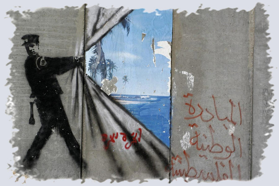 Graffiti eines Polizisten, das einen unberührten Strand hinter der Trennmauer zeigt, im palästinensischen Dorf Abu Dis in der Nähe von Jerusalem im besetzten Westjordanland, 6. März 2006 (Melanie Fidler/Flash90).