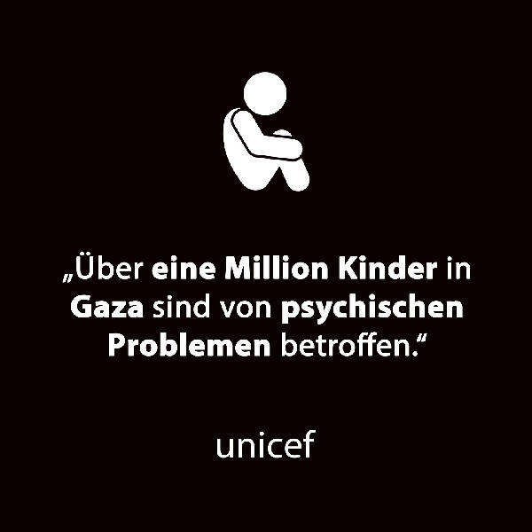 Das Kinderhilfswerk der Vereinten Nationen (UNICEF) stellt fest, dass fast alle der 1,1 Millionen Kinder im Gazastreifen angesichts des israelischen Genozids in Gaza in Form von Bombardierungen, Vertreibungen und katastrophaler Lebensbedingungen psychologische und psychosoziale Unterstützung benötigen.