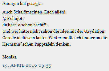 "Anonym hat gesagt… Auch Schalömschjen, Euch allen! @ S'chujot, da häst´e schon rächt!!. Und wer hatte nicht schon die Idee mit der Oxydation. Gerade in diesem kalten Winter mußte ich immer an die Hermann´schen Papptafeln denken. Monika 19. April 2010 09:35
