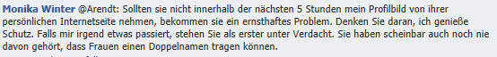 | Monika Winter @Arendt: Sollten sie nicht innerhalb der nächsten 5 Stunden mein Profilbild von ihrer persönlichen Internetseite nehmen, bekommen sie ein ernsthaftes Problem. Denken Sie daran, ich genieße Schutz. Falls mir irgend etwas passiert, stehen Sie als erster unter Verdacht. Sie haben scheinbar auch noch nie davon gehört, dass Frauen einen Doppelnamen tragen können.