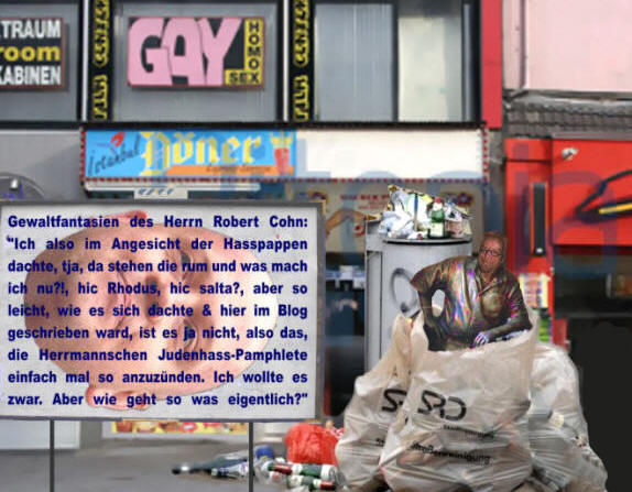 Leider gibt es ausreichend Irre im Internet. Einer - auch ein Fan von Gerd Buurmann - ruft unregelmäßig bei mir an und bedenkt mich mit Morddrohungen. Robert Cohn weiß dies, weiß also auch, mit seinem Text könnte er einen Irren anregen Klaus Franke anzugreifen, zu töten.