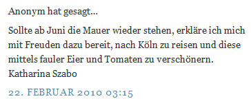 Sollte ab Juni die Mauer wieder stehen, erkläre ich mich mit Freuden dazu bereit, nach Köln zu reisen und diese mittels fauler Eier und Tomaten zu verschönern.