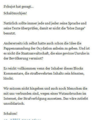 Es reicht vollkommen wenn der Inhaber dieses Blocks Kommentare, die strafbewehrten Inhalts sein könnten, löscht.