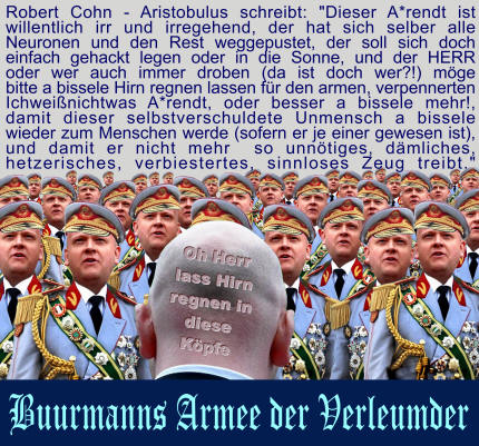 Aristobulus schreibt: Dieser A*rendt ist willentlich irr und irregehend, der hat sich selber alle Neuronen und den Rest weggepustet, der soll sich doch einfach gehackt legen oder in die Sonne, und der HERR oder wer auch immer droben (da ist doch wer?!) möge bitte a bissele Hirn regnen lassen für den armen, verpennerten Ichweißnichtwas A*rendt, oder besser a bissele mehr!, damit dieser selbstverschuldete Unmensch a bissele wieder zum Menschen werde (sofern er je einer gewesen ist), und damit er nicht mehr so unnötiges, dämliches, hetzerisches, verbiestertes, sinnloses Zeug treibt.