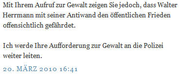 "Mit Ihrem Aufruf zur Gewalt zeigen Sie jedoch, dass Walter Herrmann mit seiner Antiwand den öffentlichen Frieden offensichtlich gefährdet."