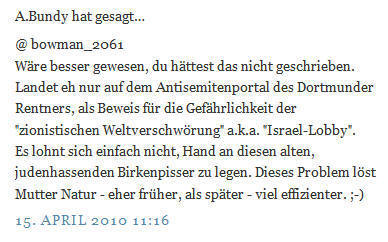 " A.Bundy hat gesagt… @ bowman_2061 Wäre besser gewesen, du hättest das nicht geschrieben. Landet eh nur auf dem Antisemitenportal des Dortmunder Rentners, als Beweis für die Gefährlichkeit der "zionistischen Weltverschwörung" a.k.a. "Israel-Lobby". Es lohnt sich einfach nicht, Hand an diesen alten, judenhassenden Birkenpisser zu legen. Dieses Problem löst Mutter Natur - eher früher, als später - viel effizienter. ;-)