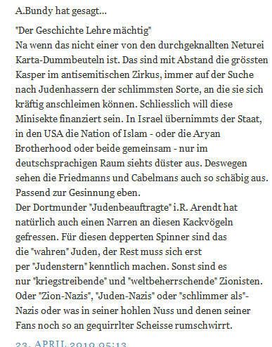 Das eigentlich bedenklich für ihn ist nicht die strafbare Handlung, der Gewaltaufruf (da entschuldigt er sich ja letztlich später noch bei dem Verfasser dieses Gewaltaufrufes. Nein und hier diffamiert er wieder, benutzt das Geschehen um eine neue Unterstellung zu verbreiten, verniedlicht, verfremdet den Antisemitismusbegriff und verharmlost den Gewaltaufruf: