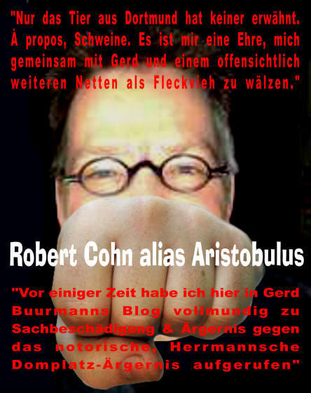 | "Der HaSS-Penner aus Dortmund, übrigens ein völlig unmaßgeblicher Patron, der sonst keinen interessiert, giftet seit Jahren hilf- und sinnlos gegen Juden und gegen den Staat Israel, wie er nur giften kann." |
