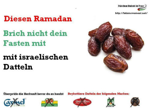 "Palestinan Students for Peace" arbeiten an einem Boykottaufruf von israelischen Datteln zur Ramadan Zeit. Oben das erste Ergebnis.