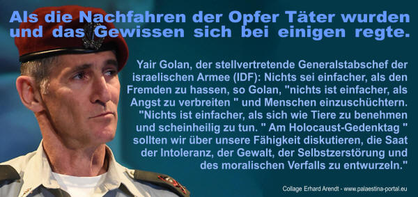 In diesem Jahr sorgte eine ungewöhnliche Rede während der Gedenkzeremonie in einem Kibbutz nahe Netanja für Aufsehen: Yair Golan, der stellvertretende Generalstabschef der israelischen Armee (IDF) fand klare Worte für die Situation im Heiligen Land. Er sehe heute in Israel ähnliche Vorgänge wie in Europa vor dem Holocaust, zitiert die israelische Tageszeitung "Haaretz" aus seiner Rede. Das Gedenken an die Shoa müsse uns "besonders zum Nachdenken bringen über die Verantwortung von Anführern, die Qualität der Gesellschaft", und es müsse zum fundamentalen Nachdenken darüber führen, "wie wir - hier und heute - den Fremden, das Waisenkind und die Witwe behandeln". Nichts sei einfacher, als den Fremden zu hassen, so Golan, "nichts ist einfacher, als Angst zu verbreiten" und Menschen einzuschüchtern. "Nichts ist einfacher, als sich wie Tiere zu benehmen und scheinheilig zu tun." Am Holocaust-Gedenktag "sollten wir über unsere Fähigkeit diskutieren, die Saat der Intoleranz, der Gewalt, der Selbstzerstörung und des moralischen Verfalls zu entwurzeln." Angriff von rechts - An diesem Tag ängstige ihn eine Sache besonders: dass "die abscheulichen Vorgänge in Europa im Allgemeinen und in Deutschland im Besonderen vor 70, 80 und 90 Jahren" stattgefunden haben - und dass es heute im Jahr 2016 - "Anzeichen dafür mitten unter uns" gebe. >>>