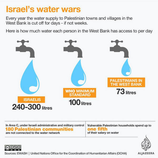 Wasser ist das einzige Thema, bei dem Israel noch Schwierigkeiten hat, seine diskriminatorische, unterdrückerische und zerstörerische Politik mit (dem Vorwand von) Sicherheit und Gott zu verteidigen. Grafik links, zum Vergrößern anklickeln.