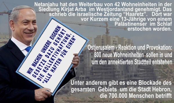 Israel nimmt Siedlungsbau im Westjordanland wieder auf - Israels Ministerpräsident Benjamin Netanjahu hat den Weiterbau von 42 Wohneinheiten in der Siedlung Kirjat Arba im Westjordanland genehmigt. Das schrieb die israelische Zeitung “Haaretz”. Dort war vor Kurzem eine 13-Jährige von einem Palästinenser im Schlaf erstochen worden. Die Aufhebung des Baustopps steht im Gegensatz zu den Empfehlungen des Nahost-Quartetts. >>>