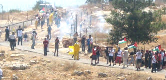 Nowadays, villagers are often joined in the demonstration by activists from around the world and often by Israeli Jews who go to Bil’in illegally to support Palestinian resistance. I joined the demonstration on two occasions. As we walked together along the dirt and gravel pathway from the village toward the barrier, we crested a small rise. About 200 meters ahead, at the crest of another small hill, arrayed in front of the barrier were several military vehicles and soldiers of the Israeli Defense Forces (IDF). It was difficult to estimate the number of soldiers – perhaps 20-25 – as they wandered among the vehicles and broke off into groups, some taking positions behind trees and rocks on our right flank. The soldiers were in full combat array with helmets, body armor, weapons, and grenades. We wore kufiyahs. >>>