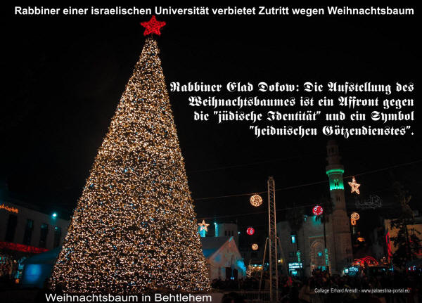 Rabbiner einer israelischen Universität verbietet Zutritt wegen Weihnachtsbaum - Der Rabbiner des renommierten Technion, der polytechnischen Universität in Haifa, hat den Studenten, die die Nebengebäude der Studentenvereinigung besuchen wollen, wegen des dort aufgestellten Weihnachtsbaums den Zutritt verboten. Der Fall, über den heute Ha'aretz auf der ersten Seite berichtet hat, hat eine Polemik entfesselt; der Sprecher des bischöflichen Rates im Heiligen Land, Wadie Abunassar, hat die Entscheidung verurteilt.