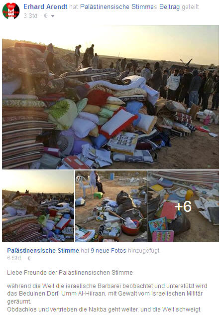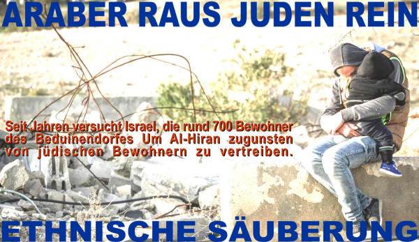 Zerstörung eines Beduinen-Dorfs in der Naqab/Negev-Wüste - In Israel gibt es 35 so genannte „nicht anerkannte“ Beduinen-Dörfer mit zehntausenden EinwohnerInnen, die von erzwungener Verdrängung gefährdet sind. So auch das Beduinen-Dorf Umm al-Ḥīrān in der Naqab/Negev-Wüste. - Magda Albrecht - 22. November 2016 - Dieses ist akut vom Abriss durch die Israel Land Administration betroffen: Die israelische Regierung plant auf den Ruinen eine jüdische Ortschaft mit dem Namen Hiran zu bauen. In den sozialen Netzwerken protestieren AktivistInnen unter dem Hashtag #Save_UmAlHiran, eine Kampagne, die Adalah (The Legal Center for Arab Minority Rights in Israel) ins Leben gerufen hat. Hintergrundinformationen zum Thema Israelische Landpolitik gegen die Beduinen gibt es auf unserer Webseite zu lesen. >>>