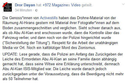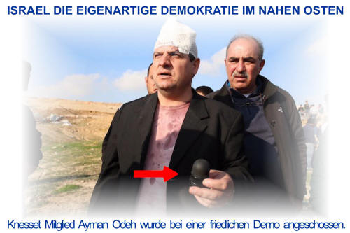 Israel setzt diskriminierende Politik gegen die palästinensische Minderheit in Israel mit tödlicher Gewalt fort - Eine friedliche Demonstration gegen den umstrittenen israelischen Regierungsplan, die Beduinen im Negev umzusiedeln, endete gestern (18. 1. 2017) mit tödlicher Gewalt. Seit Jahren versucht Israel, die rund 700 Bewohner des Beduinendorfes Um Al-Hiran zugunsten von jüdischen Bewohnern zu vertreiben. Der jetzige Wohnort in Negev wurde ihnen in den 50-ziger Jahren zugewiesen. Im Morgengrauen drangen mehrere Hundertschaften der israelischen Polizei in das Dorf Um Al-Hiran ein, um Häuser und Ställe der Bewohner abzureißen. Zur Vertreibung setzte die Polizei Tränengas ein und schoss mit Blendgranaten auf Bewohner und gewaltfrei Demonstrierende. Yacoub Abu Al-Qeean und ein israelischer Polizist starben, zahlreiche Bewohner erlitten Verletzungen, darunter auch der palästinensische Knesset-Abgeordnete Ayman Odeh. Er wurde von einem Geschoss am Kopf getroffen und musste in einem Krankenhaus behandelt werden. Fraktionschef Ayman Odeh (Gemeinsame Liste) sagte nach der Attacke, man habe „ausschließlich gewaltfrei gegen die Vertreibungen und Häuserzerstörungen demonstrieren“ wollen. So befanden sich unter den friedlich Protestierenden weitere Mitglieder der Gemeinsamen Liste, darunter Hanin Zoabi, Jamal Zahalqa, Ahmad Tibi und Aida Touma-Suleiman. >>>