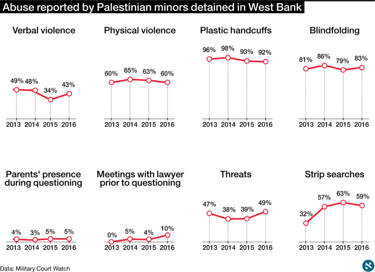 60 percent of arrested Palestinian minors report experiencing physical violence from Israeli forces Features - Kate  - Most Palestinian minors arrested by Israel claim physical violence during detention Haaretz 3 Apr by Amira Hass — 60 percent say experienced violence, only 10 percent met with a lawyer | In 2013, a UNICEF report said Israel was systematically abusing young detainees, new data shows little has changed — S.H., who lives in Bir Zeit, was 12.5 when he was arrested on Thursday January 26. He is one of 111 Palestinian minors who, according to the Palestinian Prisoners’ Society, have been arrested by the Israeli army or police since the beginning of the year in the West Bank. A further 125 were arrested in East Jerusalem. The military judge accepted a plea bargain between the prosecution and the boy’s lawyer, Khaled el-Aaraj, and sentenced S.H. to 31 days in Ofer Prison, three months probation and a 500-shekel fine. S.H. could have been released on January 29 if his mother had been willing to pay a 5,000-shekel fine. “Where would I have gotten the money?” she shouted at el-Aaraj outside the Ofer military court, when he informed her of the prosecution’s offer. “What do they want, for us to finance the occupation?” S.H., a tall youngster whose height is a bit confusing but whose face accords with his age, was released on the evening of February 26, after being in prison for a month. With a wide smile, he hugged his father and brothers who had been waiting for him at the Ofer checkpoint since the morning. The modest convoy of cars that brought him and his friends and relatives home honked and waved Fatah flags. However, a week later, his father related that S.H. “wasn’t how he used to be before he was arrested. “He used to joke, and he stopped doing that. He talked a lot, ->>>