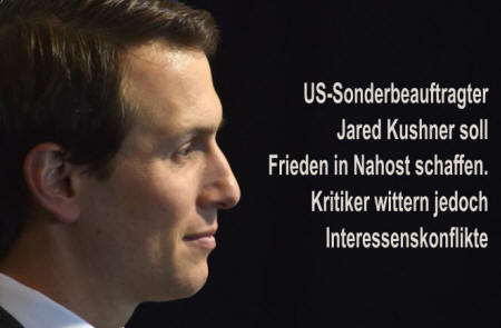 Als wären die eben genannten Aufgaben nicht genug, ist Kushner noch dazu auserkoren, als US-Sonderbeauftragter den Palästina-Konflikt friedlich zu lösen. Doch nun mehren sich die Zweifel, ob Kushner der Richtige für diese sensible Aufgabe ist. Denn wie die Zeitung "New York Times" und das Finanzportal Bloomberg berichten, hat der 36-Jährige weitaus engere Geschäftsbeziehungen in Israel unterhalten, als bislang bekannt war. Nicht zuletzt deshalb drohten dem Enkel von Holocaust-Überlebenden Interessenkonflikte, warnen Kritiker.