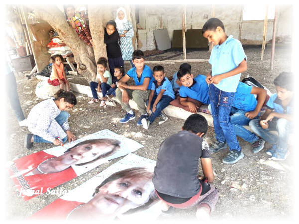 Sie bastelten in dem Ort Chan Al-Ahmar Plakate mit Merkels Porträt