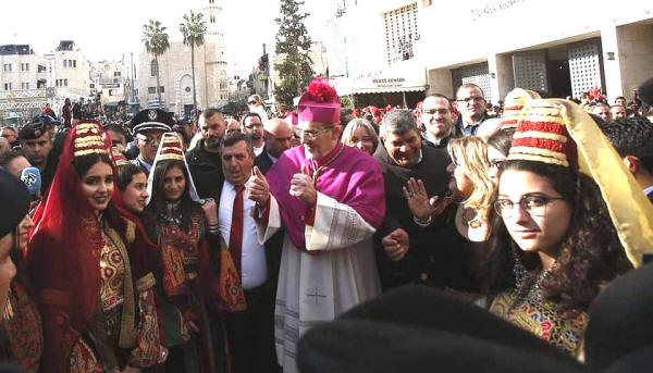 vor der Mitternachtsmesse in der Geburtskirche begrüßt.