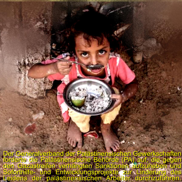Der Generalverband der Palästinensischen Gewerkschaften (PGFTU) warnte gestern davor, dass die Armutsrate im Gazastreifen 80 Prozent überschritten hat. - Die Föderation warnte davor, dass sowohl die Armuts- als auch die Arbeitslosenquote im Gazastreifen ein beispielloses Niveau erreicht haben, mit einer Armut von über 80 Prozent. Die Arbeitslosenquote liegt in der belagerten Enklave inzwischen bei mehr als 54,9 Prozent, beides ernsthafte Indikatoren für die verschlechterte Wirtschaftslage im Gazastreifen.