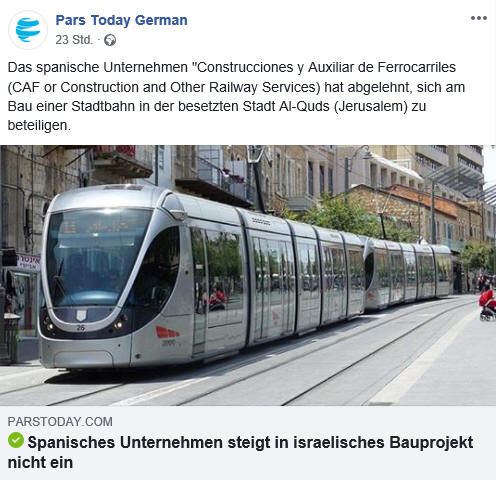 Spanisches Unternehmen steigt in israelisches Bauprojekt nicht ein - 3. 2. 2019 - Madrid(ParsToday) - Das spanische Unternehmen " Construcciones y Auxiliar de Ferrocarriles (CAF or Construction and Other Railway Services) hat abgelehnt, sich am Bau einer Stadtbahn in der besetzten Stadt Al-Quds(Jerusalem) zu beteiligen.