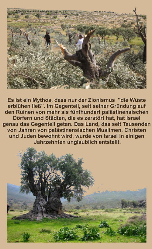 Es ist ein Mythos, dass nur das zionistische Israel "die Wüste erblühen ließ". Im Gegenteil, seit seiner Gründung auf den Ruinen von mehr als fünfhundert palästinensischen Dörfern und Städten, die es zerstört und von der Landkarte gestrichen hat, hat Israel genau das Gegenteil getan. Das Land, das seit Tausenden von Jahren von palästinensischen Muslimen, Christen und Juden bewohnt wird, wurde von Israel in einigen Jahrzehnten unglaublich entstellt.