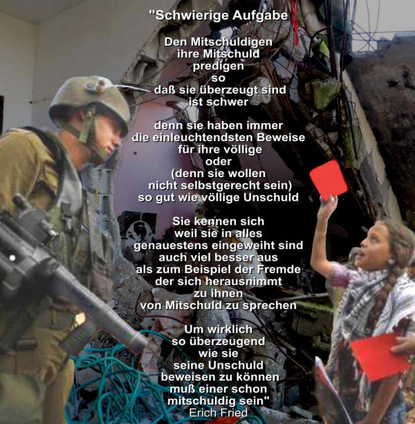 Die Menschen in Palästina gehören eindeutig zu den Schwächsten im ganzen Nahen Osten. Sie sind die Geprügelten der Region. Ihrem Schicksal gilt die ohnehin schwache Unterstützung jener Menschen und Gruppen, sich für eine gute Zusammenarbeit im Nahen Osten und für mehr Rechte und vor allem mehr Chancen der Palästinenser einsetzen und die deshalb heute von den angeblich Guten bekämpft, behindert und beschimpft werden. Dieser Kampf gegen die angeblichen Antisemiten, die sich um das palästinensische Volk kümmern, ist ein Kampf der Starken gegen die Schwächeren. So wie die Nazis mit den Juden umgegangen sind.
