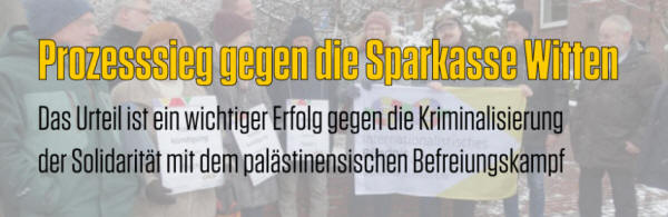 Diese Kriminalisierung und weitgehende Verweigerung eines demokratischen Rechts hat sich das Internationalistische Bündnis gegen die Rechtsentwicklung der Regierung und der bürgerlichen Parteien, das inzwischen 37 Trägerorganisationen und über 26.000 Einzelpersonen als Unterstützer umfasst, nicht gefallen lassen und neben öffentlichen Protestmaßnahmen wie einer Demonstration in Witten auch gegen die Sparkasse geklagt. Mit Erfolg! Das InterBündnis steht für die Solidarität mit dem palästinensischen Befreiungskampf gegen die Besatzung und Unterdrückung durch den israelischen Staat und kritisiert seine Diffamierung als Terrorismus. Dieser Befreiungskampf um Selbstbestimmung ist völlig gerechtfertigt und auch durch mehrere UN-Resolutionen legitimiert.