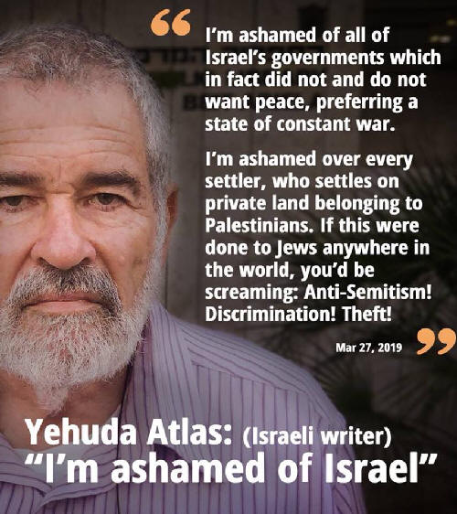 „Ich schäme mich für alle Regierungen Israels, die einen Frieden nicht wollten und nicht wollen und einen Staat mit andauerndem Krieg bevorzugen. Ich schäme mich für jeden Siedler, der sich auf privaten Boden, der Palästinensern gehört, ansiedelt. Wenn dieses irgendwo auf der Welt Juden angetan würde, hieße es: Antisemitismus! Diskriminierung! Diebstahl!“