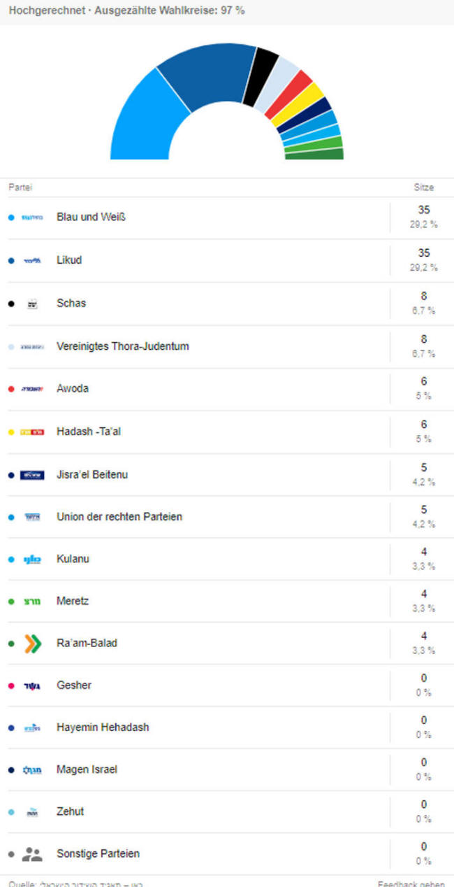 Ergebnisse der israelischen Parlamentswahl 2019 - Um 15:28 MESZ aktualisiert