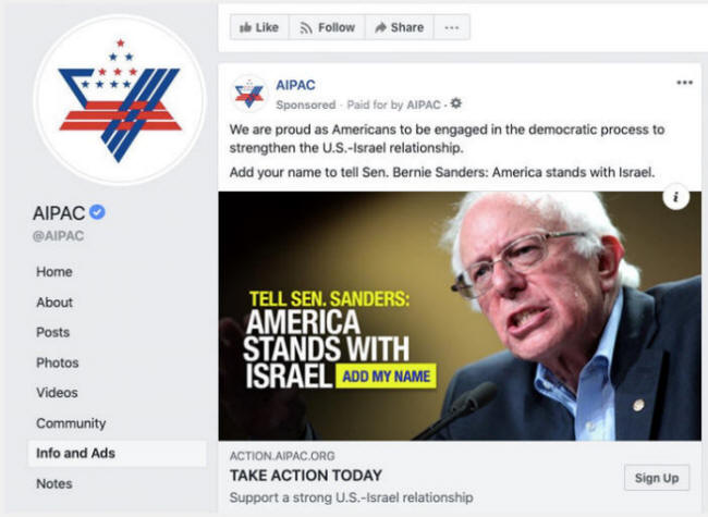 AIPAC richtet sich in Facebook-Anzeigen gegen Bernie Sanders , die sich auf wichtige demokratische Primärstaaten konzentrieren. - Robert Mackey - 9. April 2019 - Senator Bernie Sanders, der in zwei Jahren der erste jüdische Präsident der Vereinigten Staaten sein könnte, ist derzeit das Ziel einer Kampagne auf Facebook, die vom American Israel Public Affairs Committee, der Pro-Israel-Lobbying-Gruppe namens AIPAC, bezahlt wird.