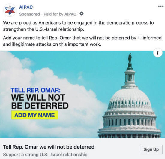 Ein Screenshot der Facebook-Seite des AIPAC mit einem bezahlten Beitrag für Rep. Ilhan Omar.