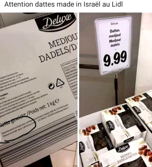 Auf jeden Fall werden Sie gewarnt: Eine große Anzahl von frischen Produkten und Trockenfrüchten, die in den Geschäften als "Israel" gekennzeichnet sind, kommen aus diesen gestohlenen Ländern, die nach dem Völkerrecht palästinensisch und keineswegs israelisch bleiben. (...)