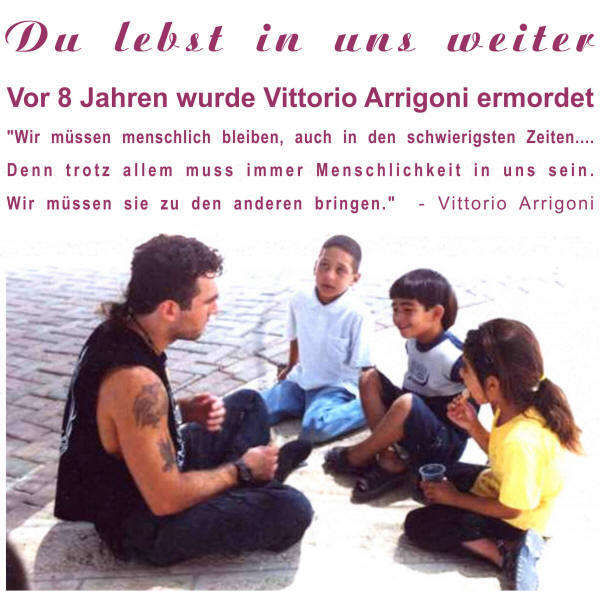 Anlässlich des achten Jahrestages seines Todes, an dem Gaza von der Besatzung belagert wird, erinnern wir uns noch immer an Vittorio durch seine Worte und Taten und hoffen, unsere Arbeit mit dem Beispiel fortzusetzen, das er uns gegeben hat. Übersetzt mit DeepL.com Quelle"Wir müssen menschlich bleiben, auch in den schwierigsten Zeiten.... Denn trotz allem muss immer Menschlichkeit in uns sein. Wir müssen sie zu den anderen bringen."