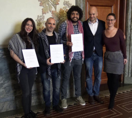 Die Humboldt-3, (von links nach rechts) Stavit Sinai, Ronnie Barkan und Majed Abusalam. sie bekommen eine Auszeichnung vom Kopenhagener Bürgermeister für Technische und Umweltangelegenheiten, Ninna Hedeager Olsen (ganz rechts) erhalten.